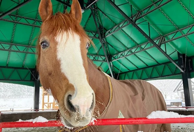 冬季はテントでちょい乗り。大人しいお馬さんをスタッフがゆっくり引いて歩きます。
