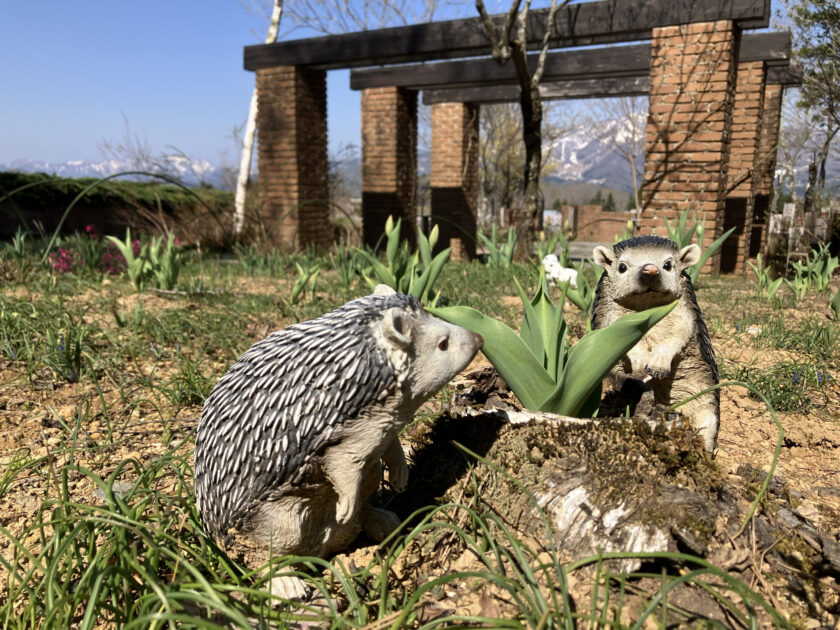 ナチュラルガーデンの切り株にチューリップの芽が顔を出しています。もうすぐ色づき始めるかな?