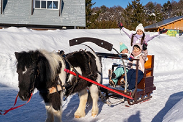 雪上をポニーに引かれてのーんびり。雪国気分を満喫してね。