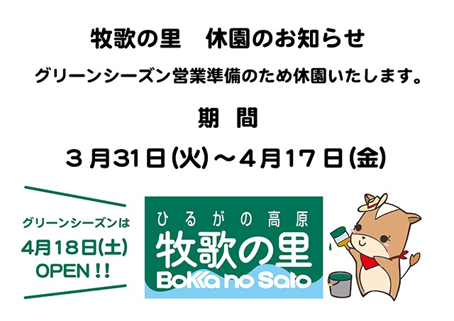 3月31日(火)〜4月17日(金)は休園 牧歌の里グリーンシーズンのオープンに向けて準備のため休園いたします。 牧歌の里グリーンシーズン開園日 2026年4月18日(土)10時OPEN! (牧歌の里温泉♨︎牧華は3月31日〜12月18日まで休館いたします)