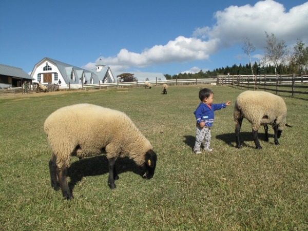 広い牧草地には羊が放牧されていて、柵の中に入ってえさをやったり、いっしょに写真を撮ったりしてふれあうことができます。 ※終了時間は16時。動物によって異なります。