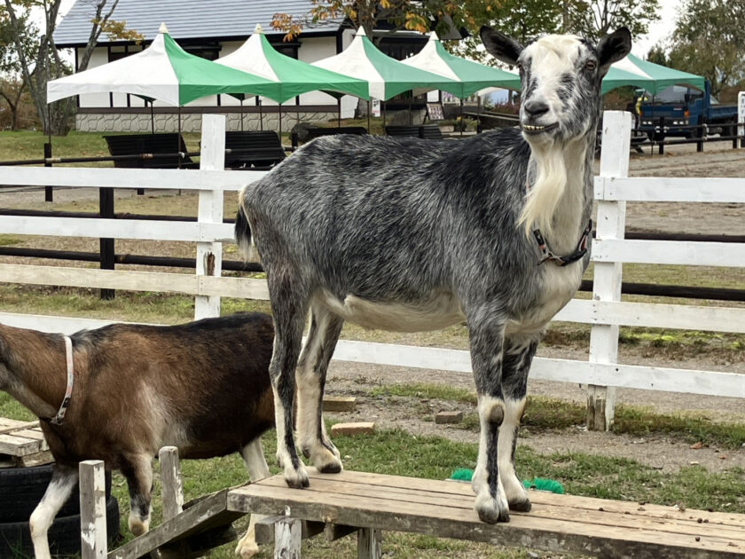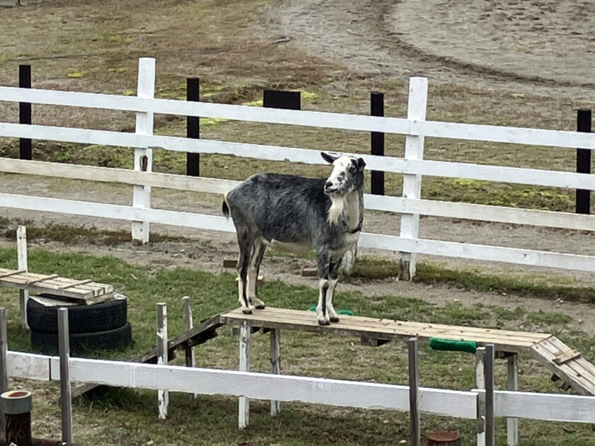 雨の日でもヤギ〜ズが自由に動けるスペースができました。テントがあるので、おやつあげもテントの下でできますよ〜♪