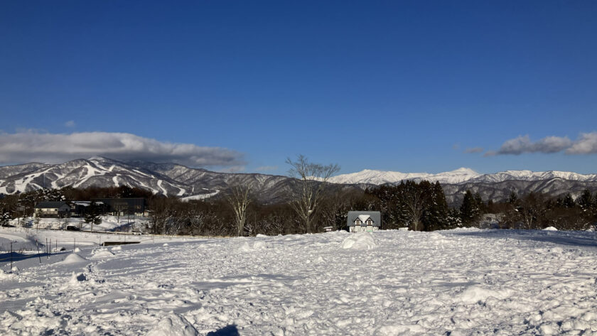 白山がはっきり見える雪遊び日和です!青空と、白い雪が眩しい〜!サングラスやゴーグルがあると良さそうです。冬も日焼けをしやすいので、お顔は特に日焼け止めをしっかり塗っておくと良いですよ〜!サングラスやゴーグルをしていると出ているところだけが日焼けをして面白い顔になってしまいます(>人<;)