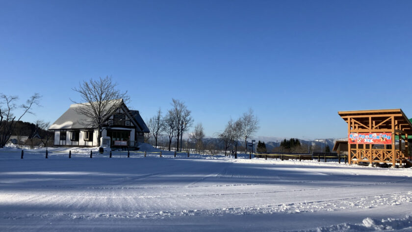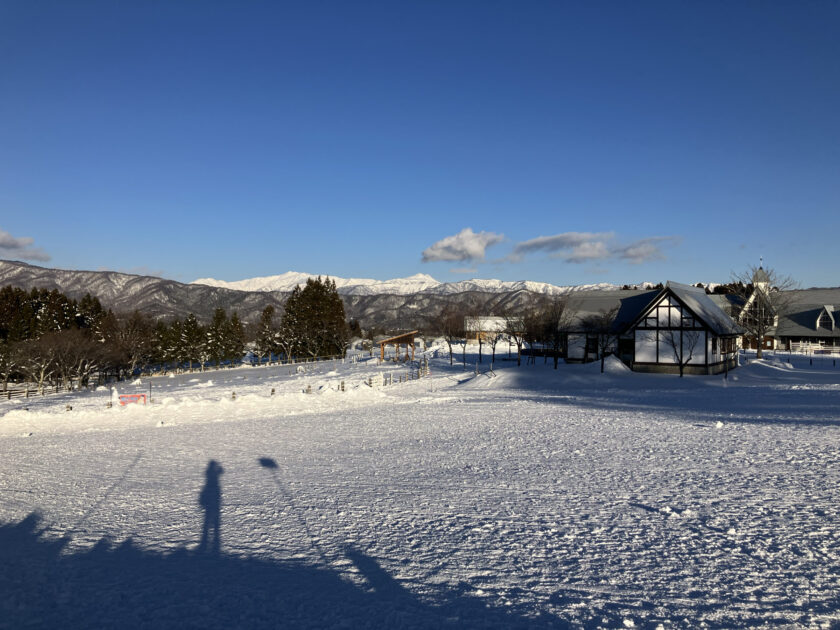 朝の誰もいない「雪遊びエリア」。今日は白山を背景に、綺麗な写真も撮れそうですよ〜!