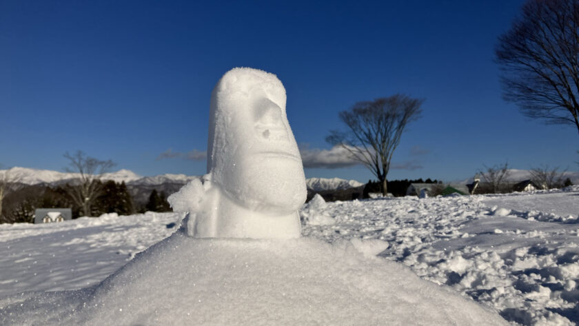 今年もフリーの「雪遊びエリア」に雪のモアイ像が出現!メインハウス1階の売店には、いろんな雪型があるのでぜひ遊び道具の一つにどうぞ。雪のおもちゃの持ち込みは、金属製のスコップは危ないので禁止していますが、おもちゃのプラスチックスコップなどは持ち込みOKです。