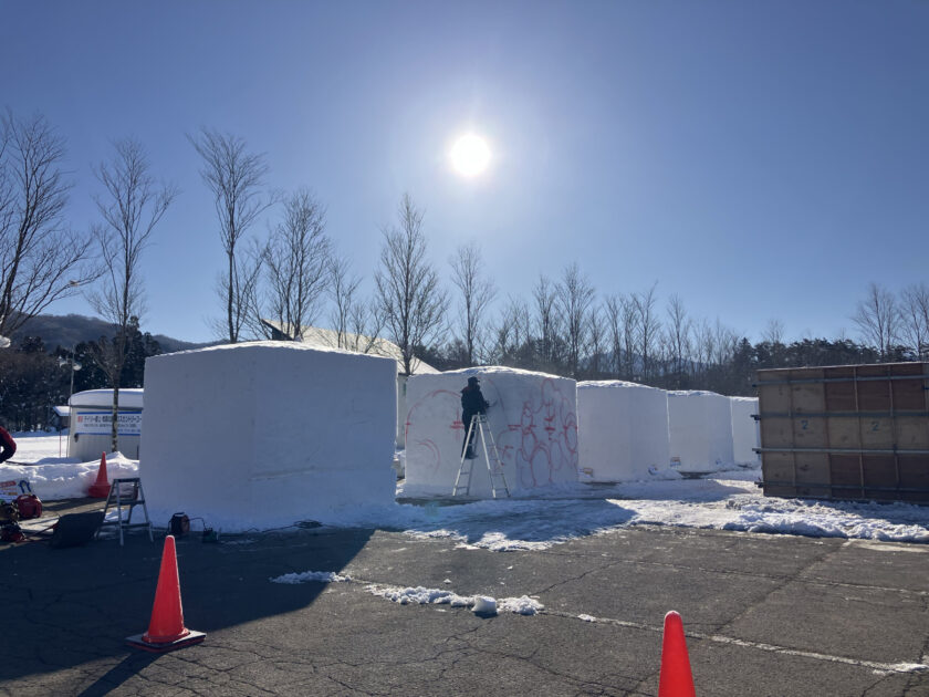 雪像作りは、春の陽気のポカポカ日和に苦戦しながらも着々と進んでいます。(画像は2月4日雪像ブロック作成の様子)