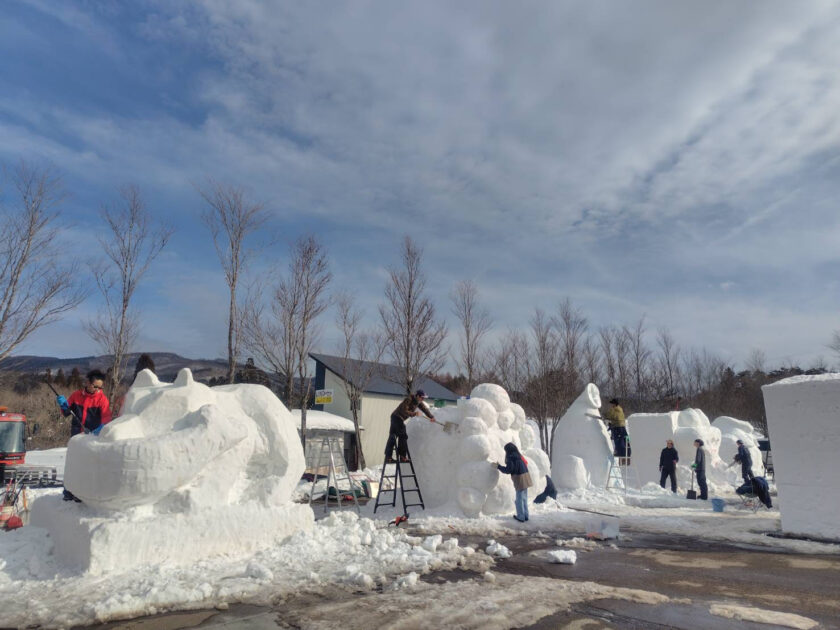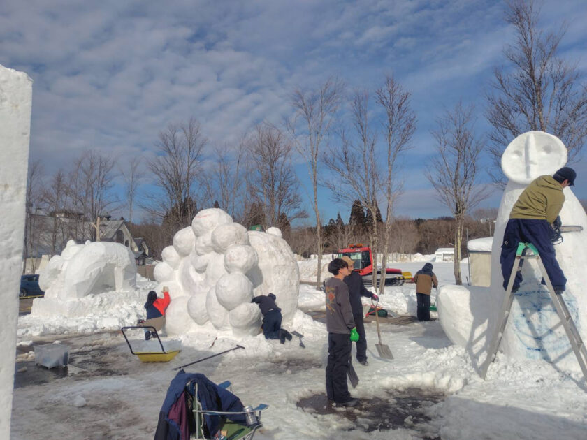 作っている途中でも溶けてきてしまうくらい暖かいので形を保ちながら皆さん作ってみえます。(画像は2月5日雪像制作の様子)
