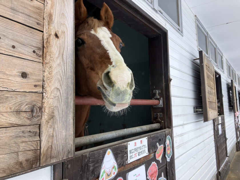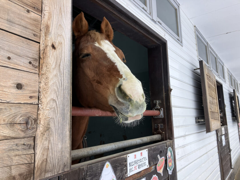 牧舎では今年の主役ウマ〜ズたちが待っています!馬のジャックスちゃんは、呼ぶと顔を出してくれる従順なお馬さん。ご飯を食べていても呼ぶと来ちゃうので、ゆっくり食べさせてあげたい場合は呼んじゃダメだな〜と反省。