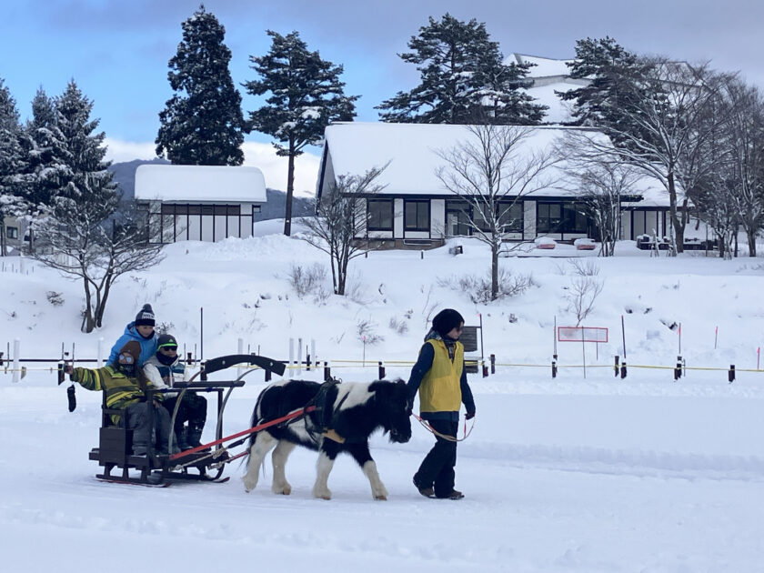 積雪量が増えて、ようやく「ポニーの馬ソリ」をスタートすることができました。かわいくて力持ちのサリーちゃんが、ソリを引っ張ってくれます。