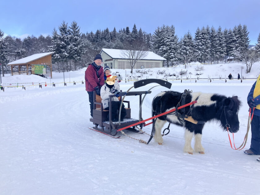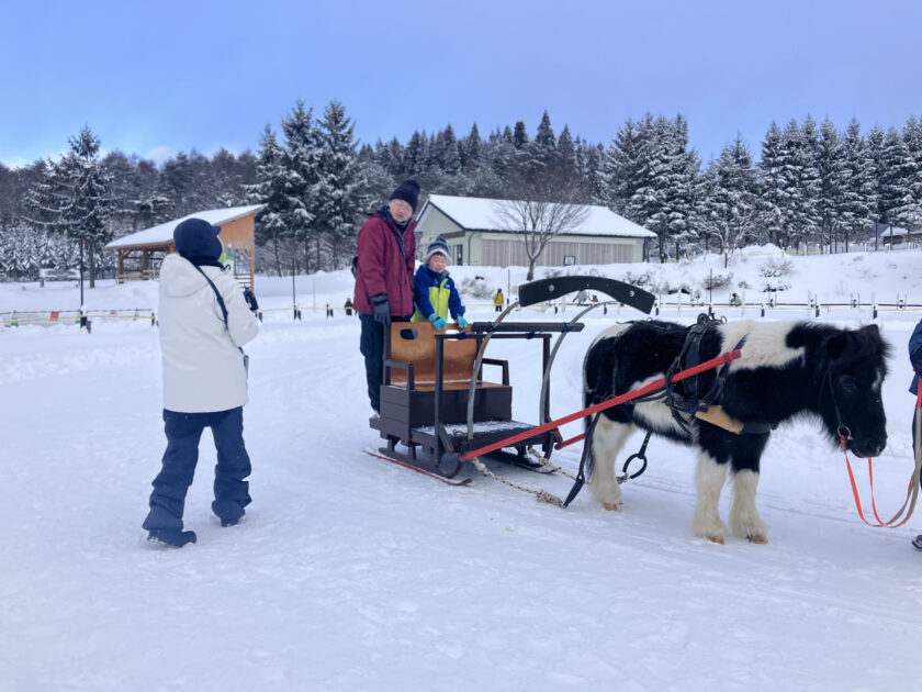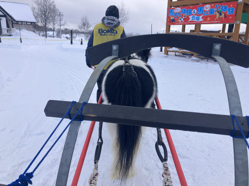 サリーちゃんにとっても、良い運動になる「馬ソリ」は13:30~15:00の冬限定イベントです。1周1500円で3名まで乗ることができます。前の人は座って、後ろの人は立って、どこの席がいいかな〜?