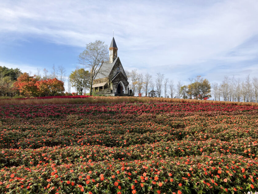 教会の裏のもみじは緑から赤のグラデーションが綺麗な時期です。真っ赤になるのは来週末頃になりそうです。