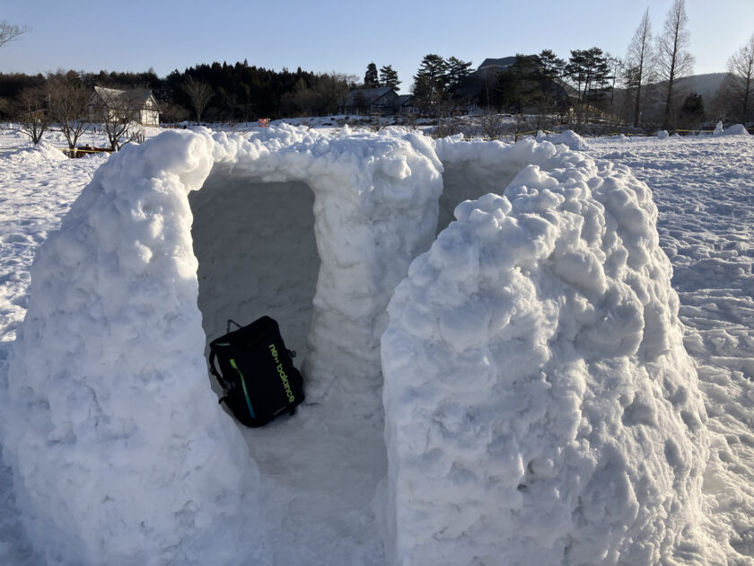 昨日のお客様が作った、大きな「かまくら」。中央に柱があります。大きなリュックでサイズ感を比較すると、こんな感じ。雪を少しずつ積み上げて、壁を削って、作ってあります。素晴らしい!