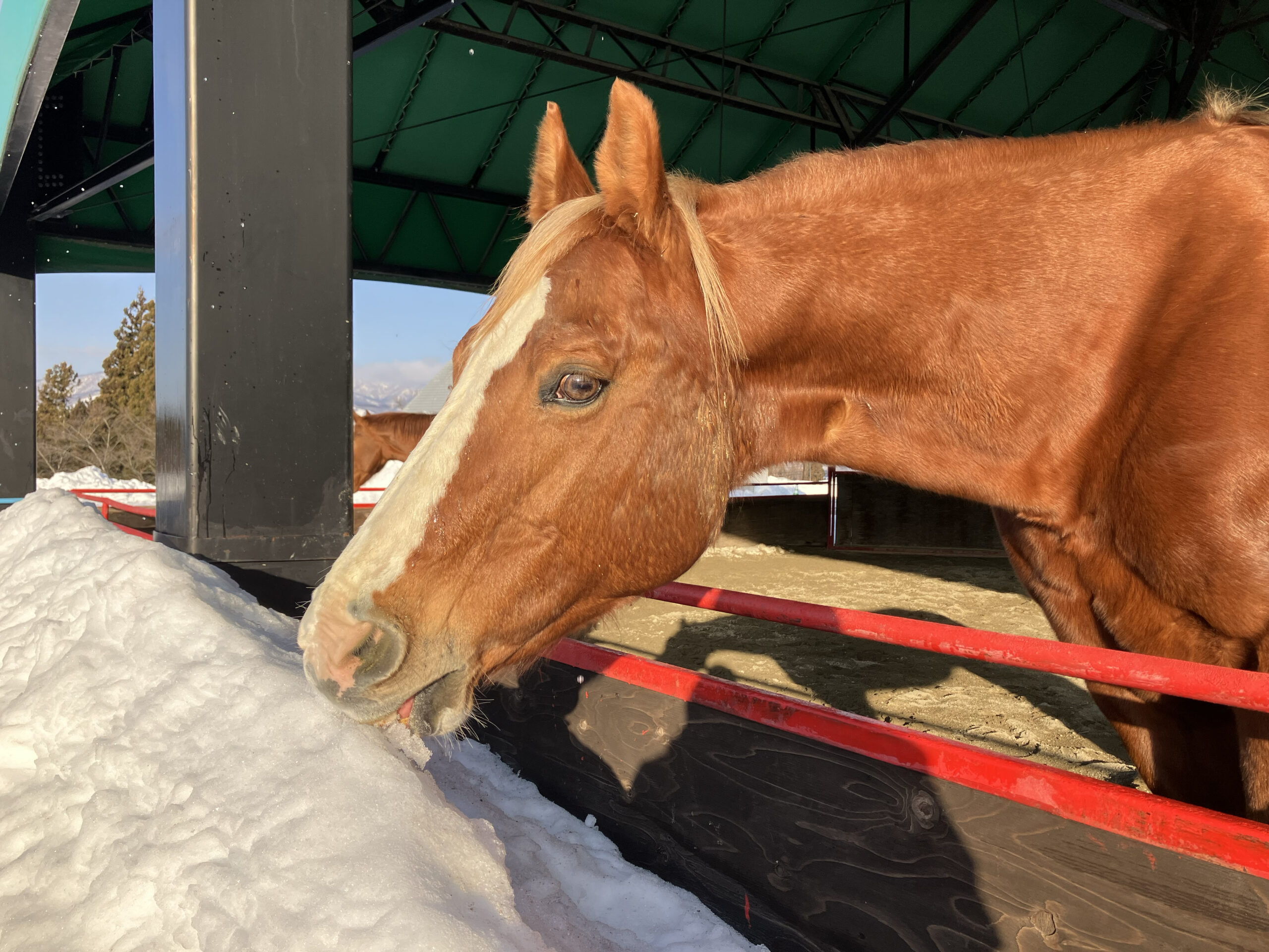 遊んでいるとポカポカ暑くなってくるので、水分補給はしっかり行ってくださいね♪馬のジャックスちゃんも、今日はガリガリ雪を食べて水分補給をたくさんとっていました!