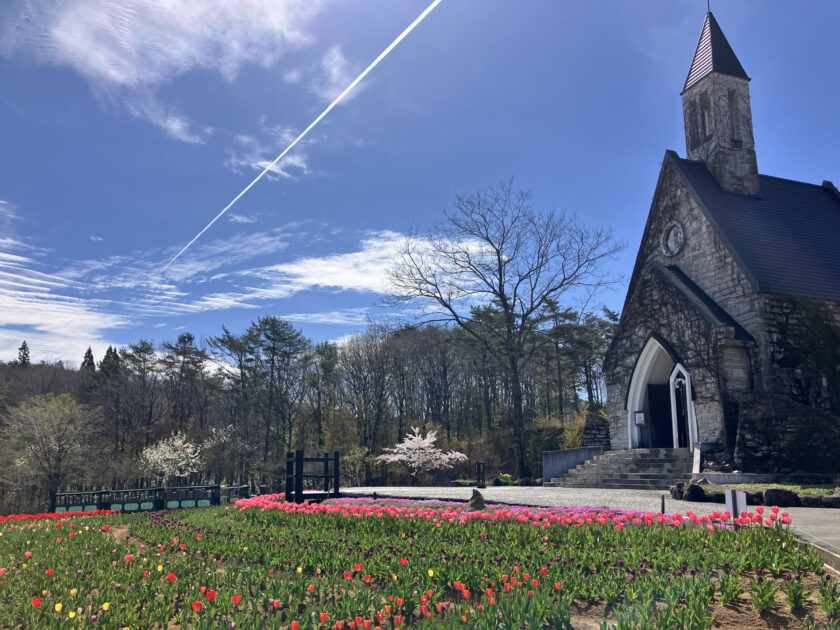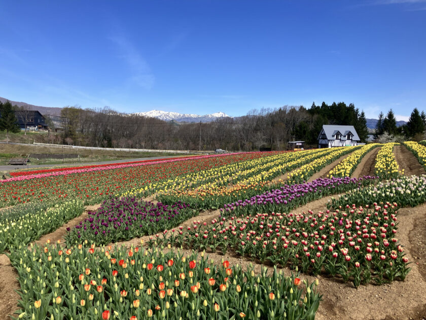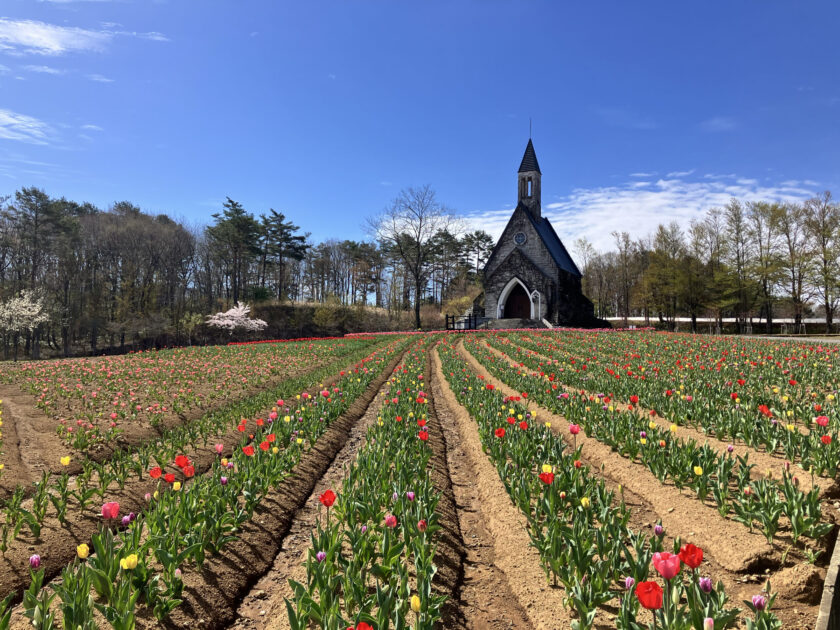 春のお花を代表するチューリップ畑は、ただいま3分咲きです。昨日の午前中はまだ1分咲きくらいでしたが、たった1日で一気に開花しています。