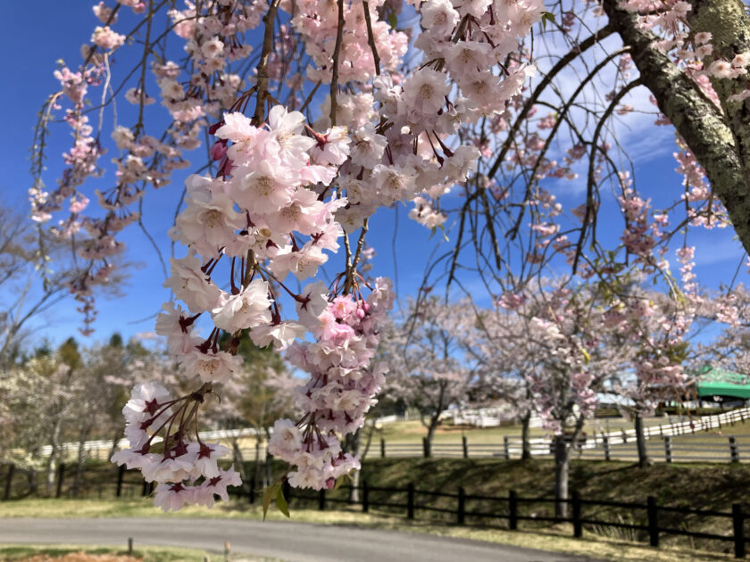 放牧場の桜は葉っぱが出てきました。ヒラヒラと舞う桜の花吹雪が、春の雪のようで美しい♪チューリップと桜をセットで撮影できるのは今だけです。