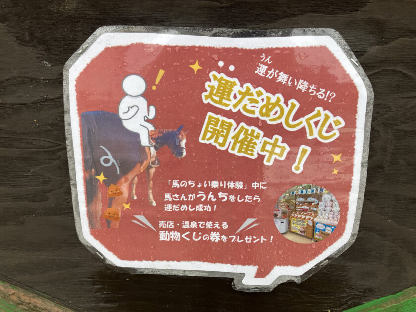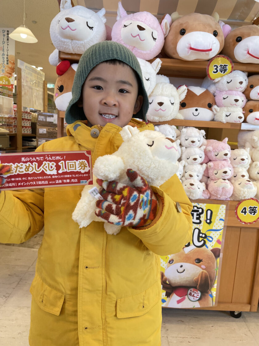 「馬のちょいのり体験」中に、馬が「うんち」をすることが稀にあるのですが、見事そのタイミングに出会った方には、メインハウス売店の「動物くじ」1回分をプレゼント!運が舞い落ちたら、楽しい運を呼ぶ!ウインターシーズン限定イベントです。