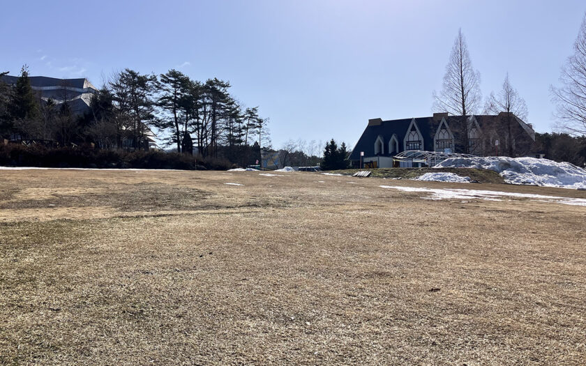 第2ソリゲレンデは、ほとんど雪が解けて芝生広場に変わってきています。暖かい日はテントが立てられそうです。