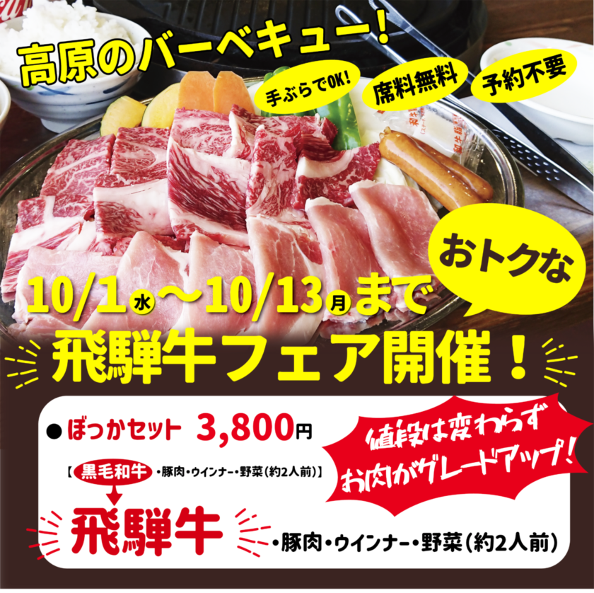 バーベキューハウス味広場では、今日から秋の「飛騨牛フェア」を開催!10月13日(月)まで「ぼっかセット」2人前3800円が、値段はそのままで黒毛和牛が飛騨牛にグレードアップ!お得に飛騨牛を味わえます♪