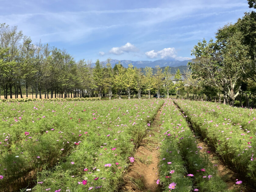 「秘密の花畑」のコスモスもピンクや白の可愛いお花を風に揺らしています。
