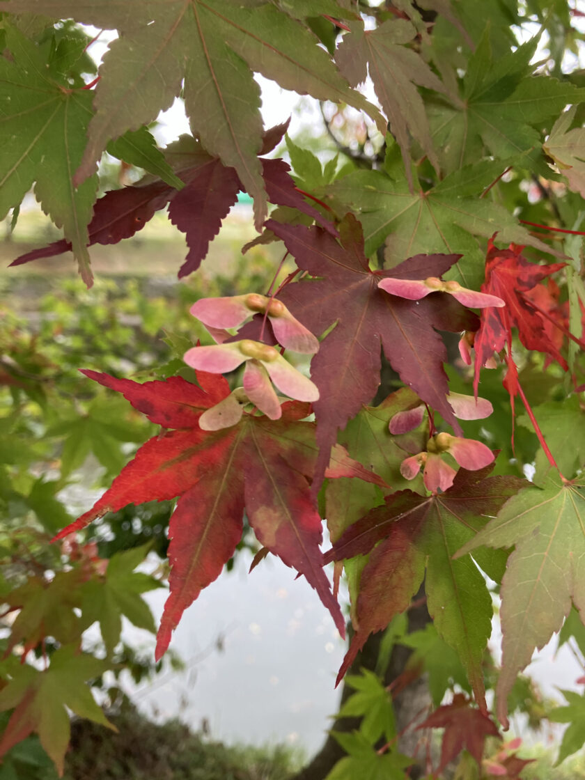 お花のフィナーレとともに、もみじの紅葉にバトンタッチ。緑だった「もみじ」の葉っぱは葉の端から赤くなり、今はマーブル模様。ピンクのプロペラのような花と種もついてる!かわいい♡