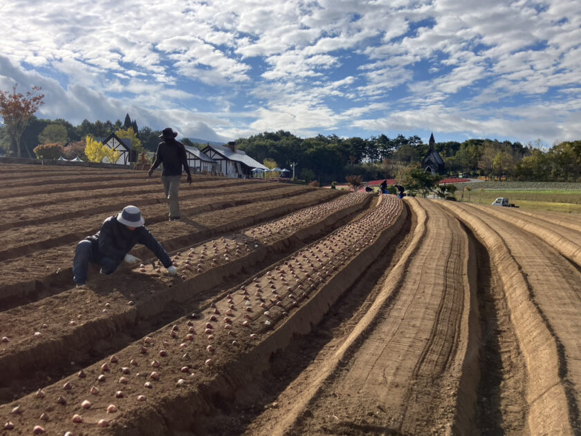 「虹色の花畑」のチューリップの球根植えは、10人くらいのスタッフで一気に進みます。