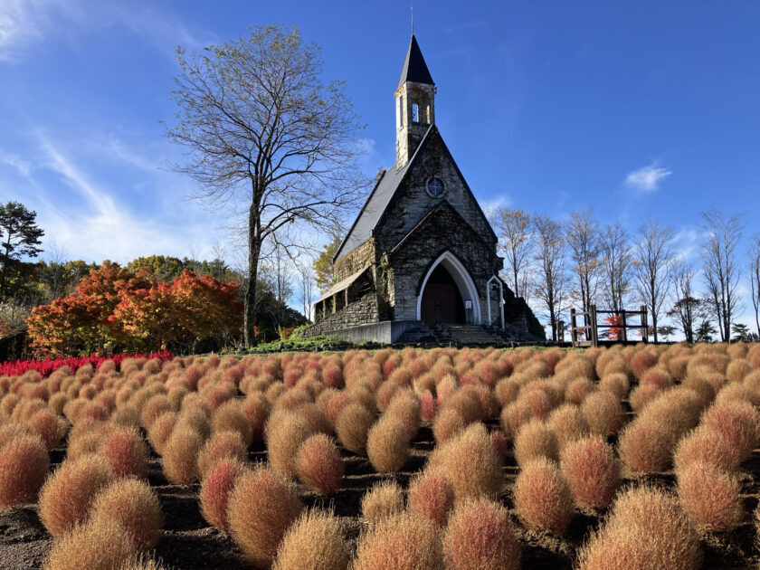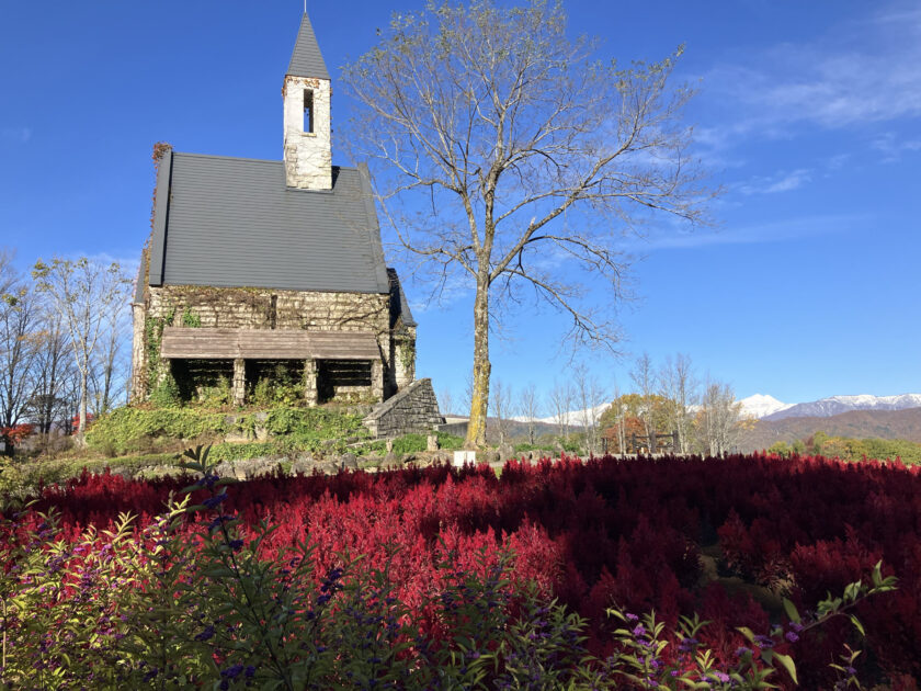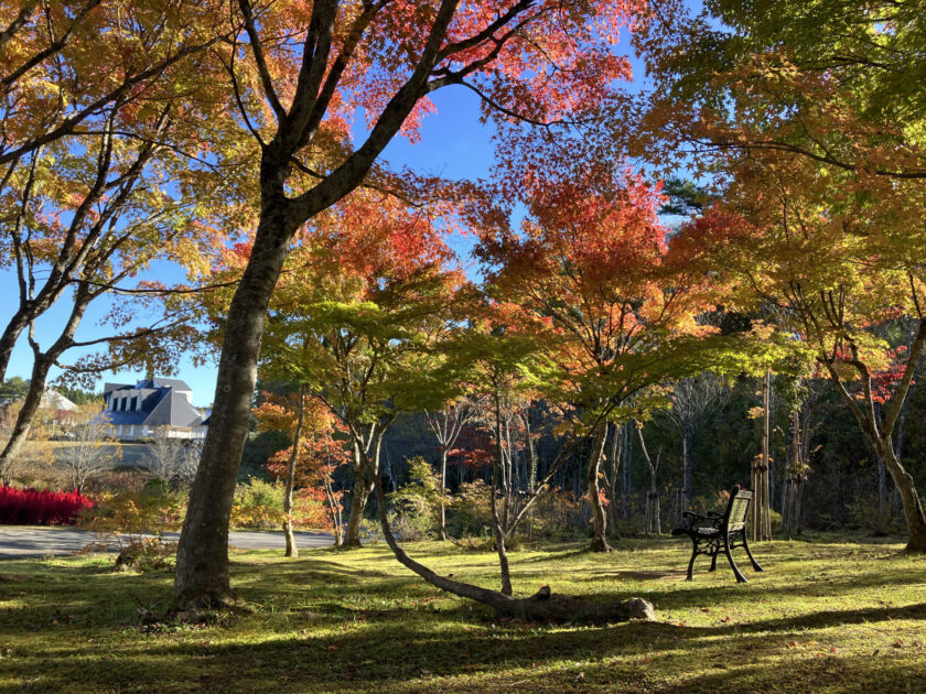 教会の裏の「もみじ」も赤色が多くなってきましたが、まだ緑とのグラデーションを楽しめます。野鳥の囀りも聞ける癒しスポットです。