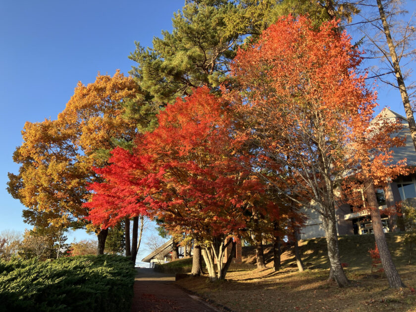 手作り体験工房へ続く煉瓦の小道の上では、大きなもみじの紅葉が見頃を迎えています。晴れた日の16時〜閉園間近には夕陽が当たって1日の中で一番発色が綺麗に見えますよ〜!