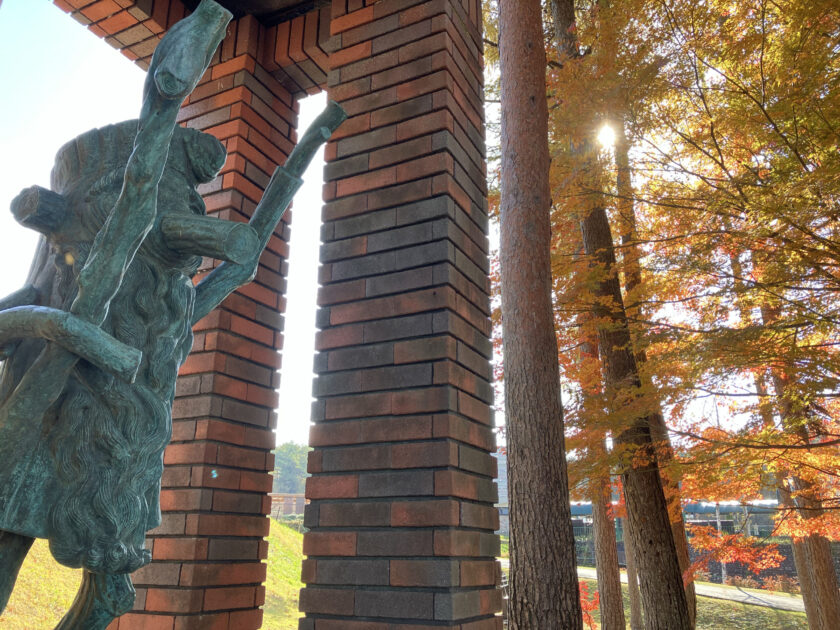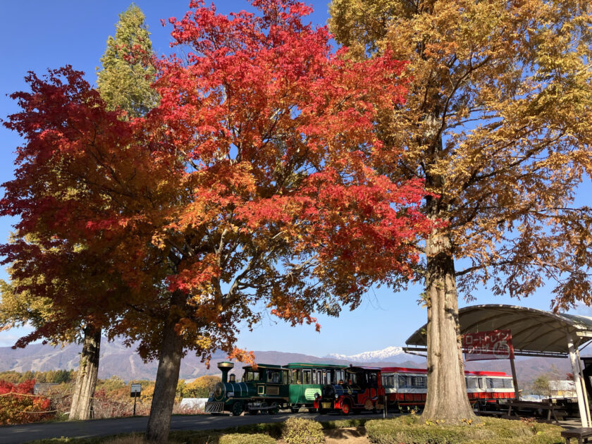 トレインのりばでは大きなメタセコイヤともみじが紅葉しています。