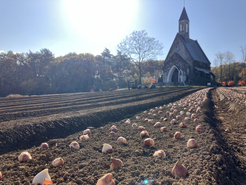 来年の春に咲くチューリップの球根植えは、いよいよ「教会の花畑」で完了です。