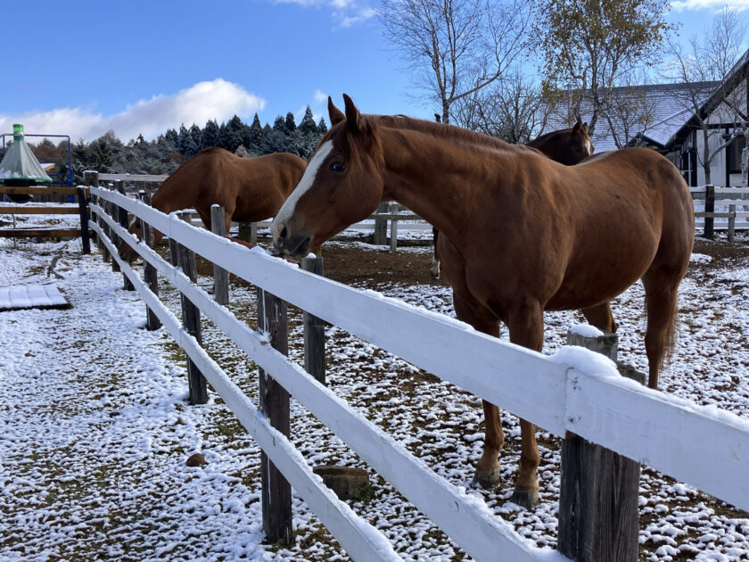 動物たちは冬毛になって寒さに強いので、雪が降っても放牧は行います。運動ができない方がストレスになるので、しっかり遊ばせます。ウマ〜ズは雪が降ってテンションが高めで走り回っています。