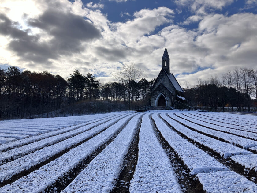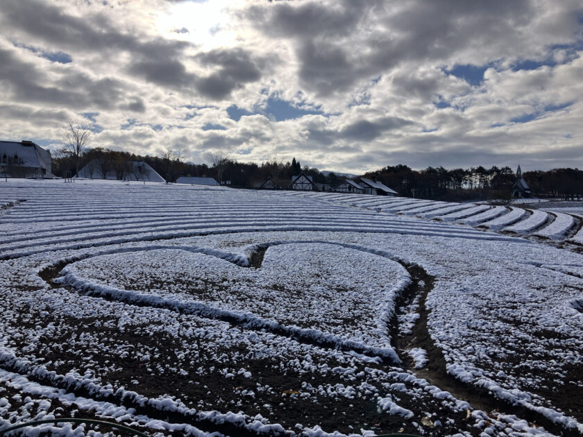 朝の積雪は1cmにも満たないうっすら一面の雪の世界。これくらいの積雪だと午前中で溶けてしまいます。雪の降り始めはとても綺麗な世界ですよ〜!手が痛いくらい冷えるのでマフラー、手袋、冬用ダウンジャケットがあると良さそうです。