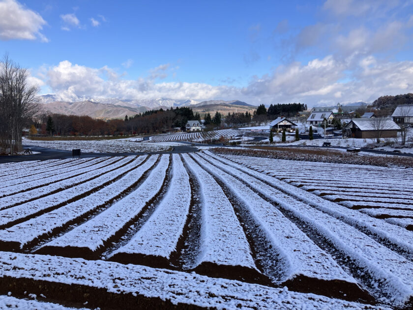 畑の畝にうっすらと積もった雪が模様を描き出しています。