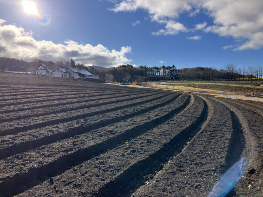 来年の春に畑を満開にする31品種20万球のチューリップの球根が「虹色の花畑」の土の中で眠っています。これから雪が1m以上積もり、3月まで雪の中で春が来るのを待ちます。