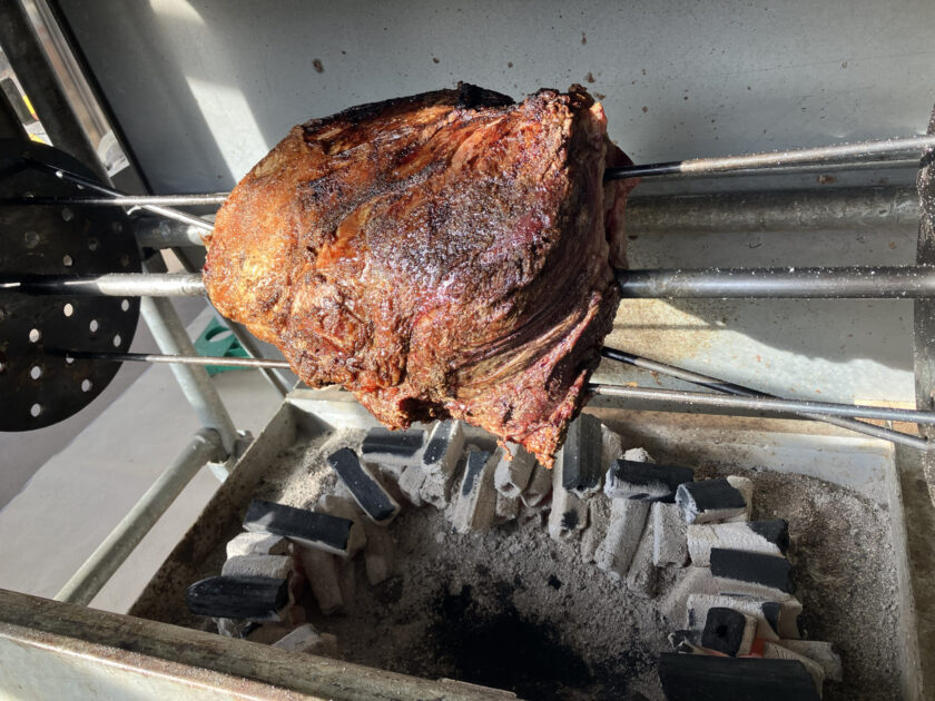 早朝から炭火でじっくり焼いている飛騨牛♪柔らかくて美味しいですよ〜!この後切り分けて、1皿500円で大盤振る舞い!1回目は12時から、2回目は12時30分から開始いたします。