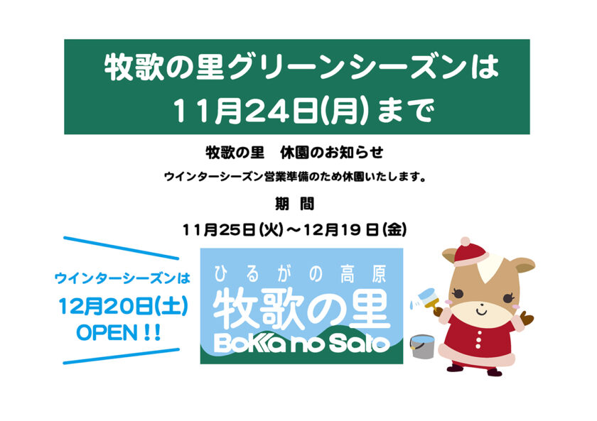 明日11月25日(火)から12月19日(金)までの期間はウインターシーズン営業の準備のため休園となります。