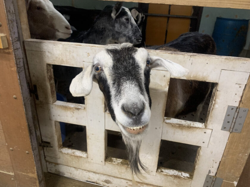 ヤギ〜ズのシーザーくんは、いつも通り顔を出してニヤリと笑っているようです。動物たちのいつもの様子を見ながら、いつもの行動と変化が無いかを毎日チェックします。