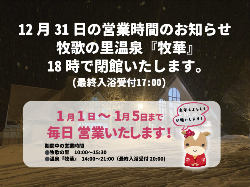 【大晦日営業のお知らせ】温泉♨︎牧華は18時閉館の短縮営業となります 2025年12月30日 カテゴリー:おしらせ Tweet 『牧歌の里温泉♨︎牧華』は大晦日は短縮営業となります。 営業時間 14:00〜17:00受付終了(18:00閉館) 1月1日〜1月5日は通常営業時間で毎日営業いたします!