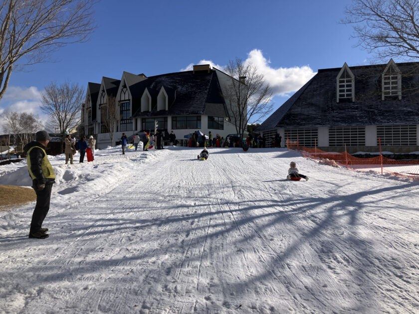 スノーアクティビティは第1ソリゲレンデでのソリ滑りだけになっています。15mくらいのコースですが、皆さん楽しんでいただいています。午前中は混み合っています。