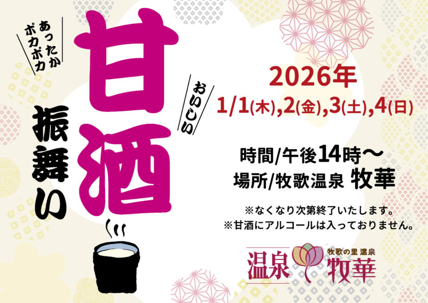 14時からは毎年恒例の牧歌の里温泉♨️牧華にて『甘酒のふるまい』を開催いたします。