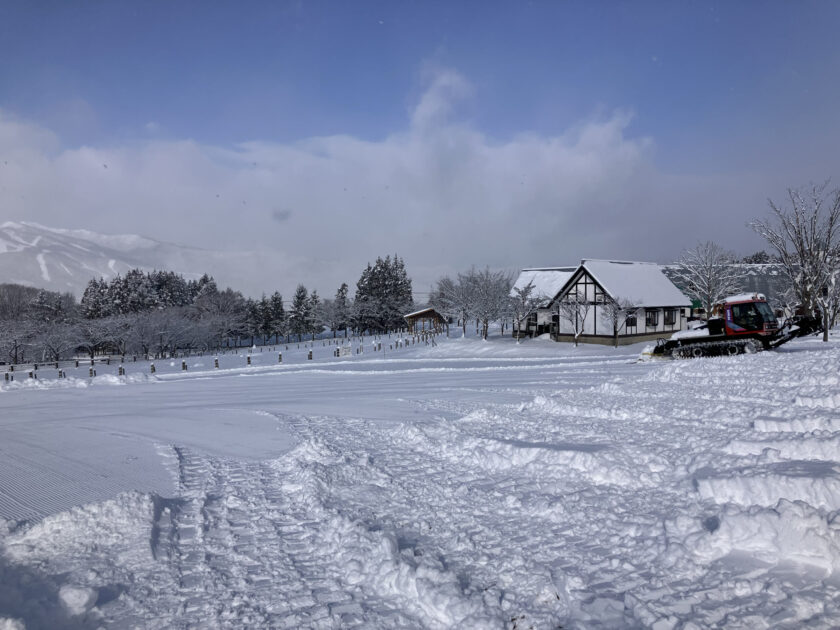 園内は雲と青空と、新鮮な雪の世界がとても美しい〜♪でも、スノーラフトのコースを作るには、まだ雪が足りません。