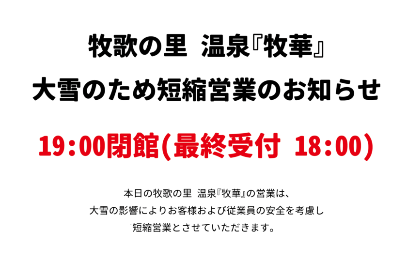 【臨時のお知らせ】本日の温泉「牧華」は大雪のため19時閉館となります 2026年01月24日 カテゴリー:おしらせ Tweet 本日の牧歌の里温泉『牧華』の営業は、大雪の影響によりお客様および従業員の安全を考慮し短縮営業とさせていただきます。 東海北陸自動車道 美濃IC〜飛騨清見IC間が通行止めとなり、今後の雪の状況も好天する兆しがないため本日は19時閉館となりました。 ご了承ください。 明日以降は「牧歌の里」および「温泉♨︎牧華」は、通常通り営業を予定しております。