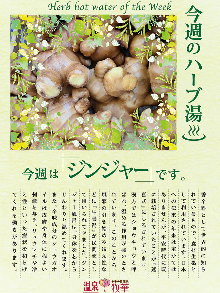 週替わりハーブ湯は「ジンジャー」です。体を芯から温めて、寒暖差が激しい今の季節は風邪を寄せ付けないようにしましょう!