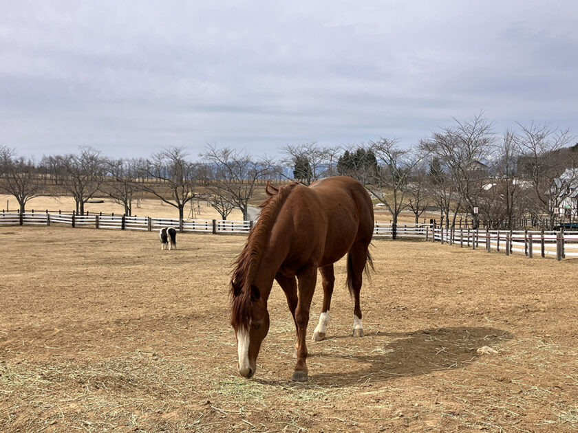 放牧場では、馬の放牧が長閑です。時々、馬の顔を真剣に見てみると、春の陽気に眠くなっているお顔を見ることができます。いろんな表情があるウマ〜ズに、ぜひ会いに来てくださいね♡