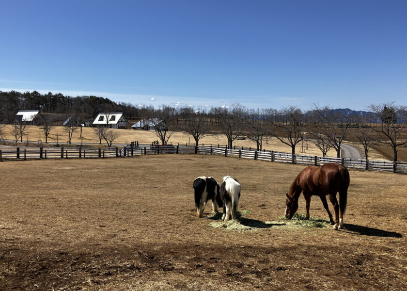 馬の放牧場では、草に夢中のワラワラくん、アートくん、サリーちゃん。