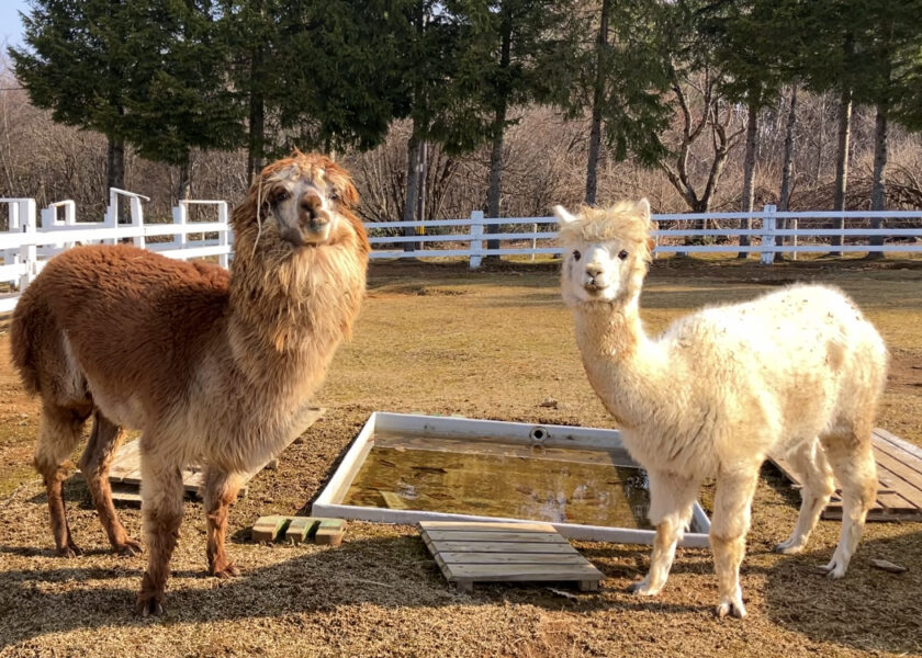アルパカの放牧が始まり、外で気持ちよさそうなアルパカのメロディちゃん&キャサリンちゃん♪
