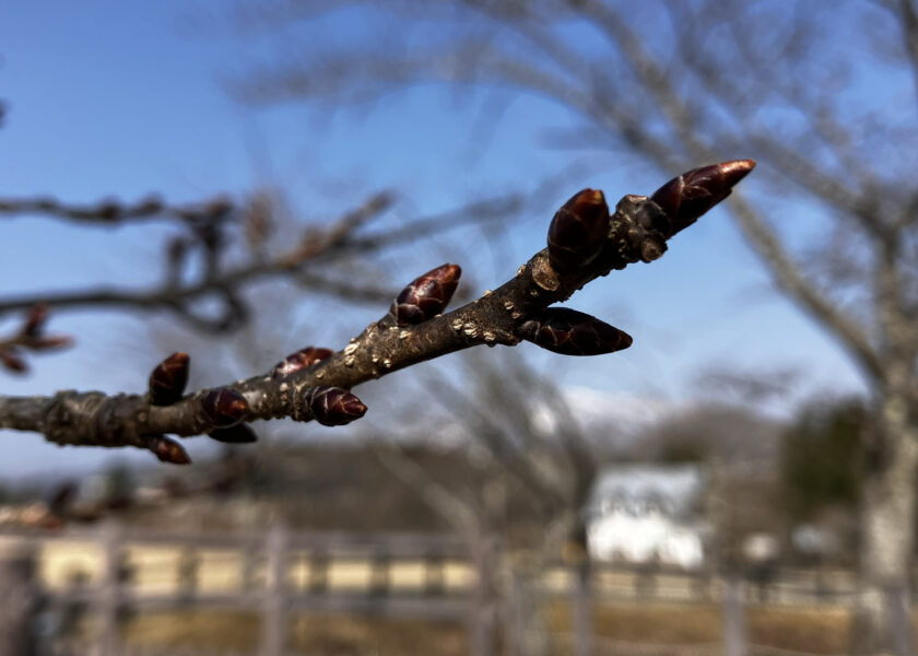 同じ郡上市内の標高300m付近の「郡上八幡」エリアでは桜前線が到達しています。標高1000m付近の牧歌の里では、桜はまだ蕾の状態。この暖かさで少しずつ膨らんできているように見えます。