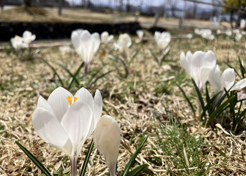 園内で2番目に咲くクロッカスは、白、紫、黄色。小さな花が風に揺れています。