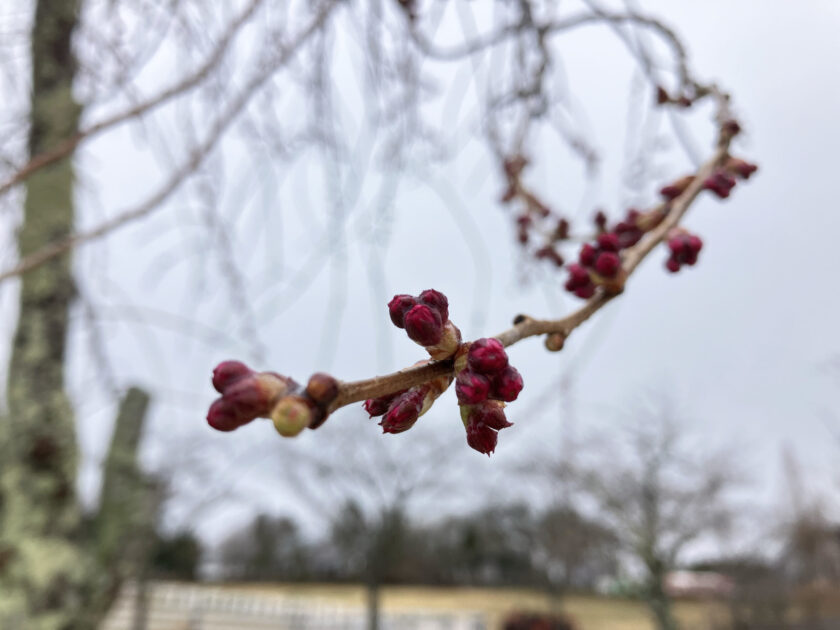 昨日までに、一気に膨らんだ桜の蕾も冬に戻ってびっくりしているかな?