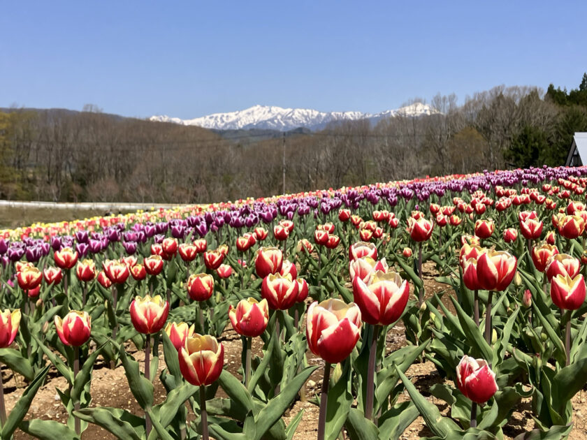 青空!雪が残る白山!色鮮やかなチューリップ!最高〜!!!!と叫びたくなるくらい、「チューリップまつり」の始まりとともに一気に満開に近づきました。気温は暖かく、調節しやすいジップパーカーを羽織って気持ちが良い体感気温です。