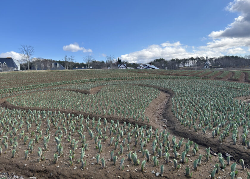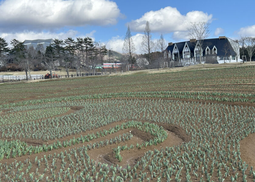 茶色だった畑が、チューリップの葉の緑色に見えるようになってきました。